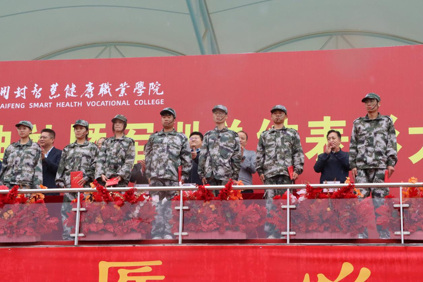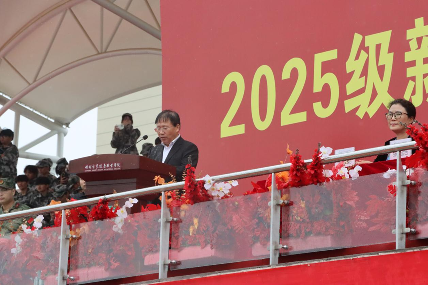 2025年9月26日上午,开封智慧健康职业学院2025级新生开学典礼暨军训总结表彰大会在学校体育场隆重举行。