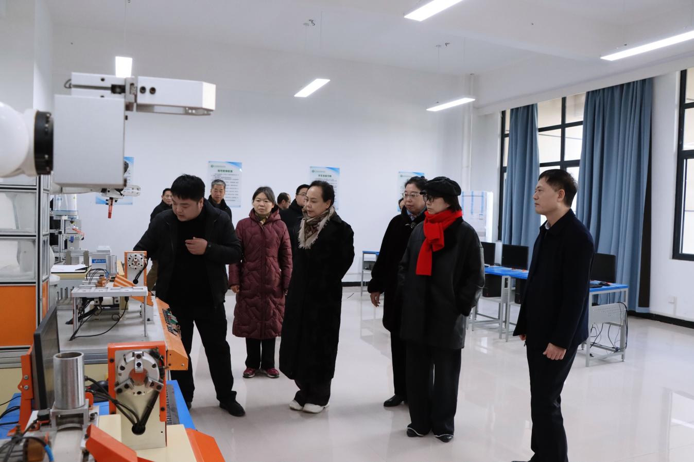 沈洁霞、何新一行先后实地调研我校实训室、产教融合实践基地等教育教学场所,深入了解校企合作与实训设备配置使用情况。调研过程中,王森校长就我校办学理念、校企合作、产业学院与实训基地建设等情况进行了介绍,并就教育教学改革、人才培养等办学情况进行交流探讨。